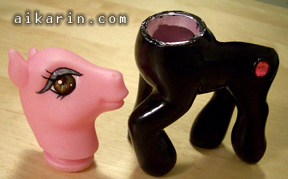 From a Super Long hair, she first becomes bald. A new tail made of white and black synthetic hair is added later. The "veins" on her head were sculpted on, painted, then coated with an iridescent purple glaze. #103 gets her name from the number Hasbro stamped under her hoof. No, I didn't make 102 other Borg ponies! =) #103's head piece was sculpted on first, with a light embedded in it. Then, the whole apparatus was painted black. The light/headpiece is not removable. But it's an LED, so it should last for quite some time. There is a tiny switch to control the light from the outside. My digital camera made the light look yellow...it's really supposed to be red. So, the pic to the left has been corrected using Photoshop. I normally wouldn't do that, but the color was waaaay off. =) Her eyes were almost completely repainted shiny silver with a strange iridescent crescent. It shows up as a purplish-pink, but only at certain angles. Top angled