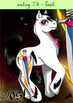 Her eyes are dark purple with an orange swirl. She has a white blaze
