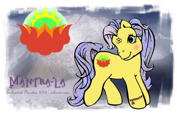 Description: Mantra-La is a yellow pony with indigo and blue mane