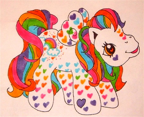 Description: This pony is super colorful! She is really detailed with rainbow hearts and a white body.