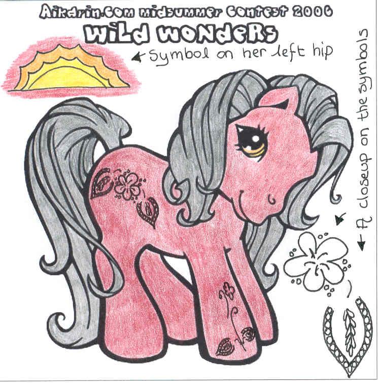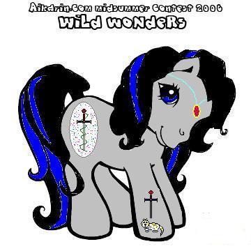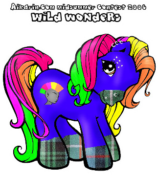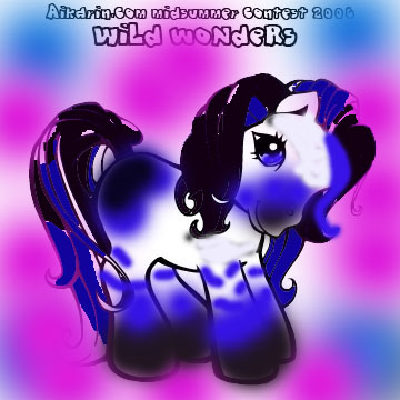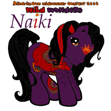 Description: Naiki is a dark purple pony with black mane and tail. In her mane is one single stripe (like the one in G1 Baby Moondancer's and Baby Glory's mane) of deep red.