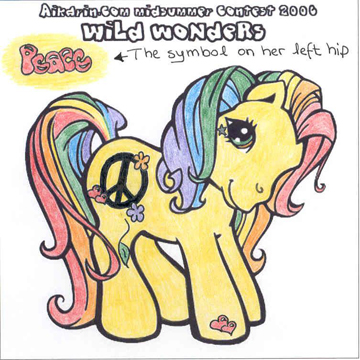 Description: Peaceful Mind has a yellow body and a rainbow mane and tail in six colours: red, orange, yellow, green, blue and purple. Her eyes are green and orange, and right under both her eyes there is a metallic star attached. On her hoof she's got two small hearts, one bigger then the other. On her right hip she's got the symbol for peace, two flowers (one orange and one purple), two hearts (also here one is bigger then the other) and a green leaf going down her leg. On her left hip she's got the word "peace" spelled out in red bubbly letters.