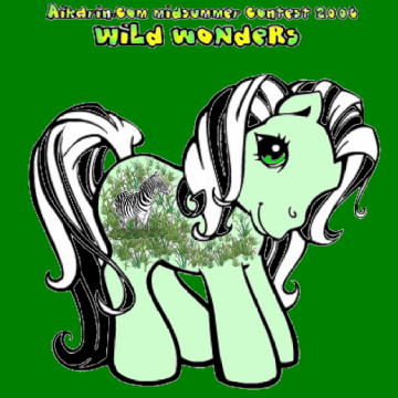 Description: She is a light green pony with back and glow in the dark (white) hair, she has a Zebra semi-hidden in vegetation as a symbol