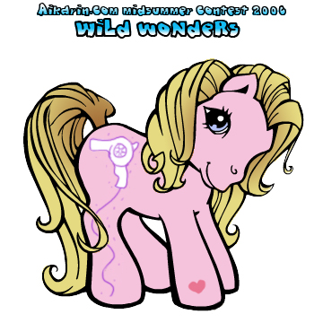 Description: A fuchsia pony, with translucent sky blue faerie wings. Her eyes are sky blue, with aqua swirl, and the symbol of a raindrop below her eye. Her hair is aqua. Her symbol is a grey dolphin, with white underbelly, black eyes, and blue wings