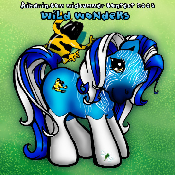 Description: Dart is actually a Quagga (extinct zebra subspecies). She's blue with white legs and a dark blue muzzle. Her face is covered in white zebra stripes that get bluer as they go down her neck until they vanish about halfway across her back. Her mane is striped a darker blue and white and is short enough it stands up, as with all zebras, except for a long tail at the very base of her neck. Her tail matches her mane. Her eyes are pale gold with a slightly darker gold swirl. Her symbol is a bright yellow and black poison dark frog. It seems to be hunting the little green dragonfly on her forehoof.