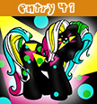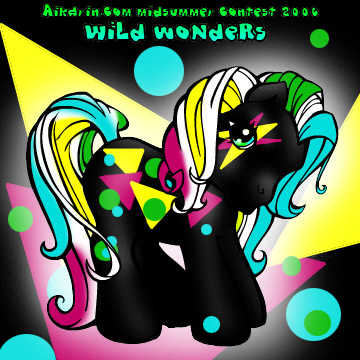 Description: Neon Lights is a black pony with bright blue and green eyes. Her hair is glow-in-the-dark with streaks of neon blue, green, yellow, and pink. Her symbols are neon geometrical shapes that run down both sides of her body. On her display side she also has a blue hoof circle and a yellow/pink triangles over her eye.