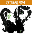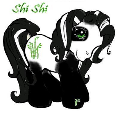 symbol. Her ears also fade the lower down on her face. A black splotch on her green eyes. Her hair is mainly black with streaks of white. Her symbol is several stalks of bamboo. A small bamboo stalk is on her right hoof.