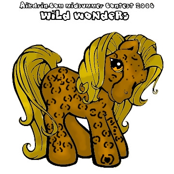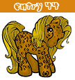 Description: Spotty Dreams is tan. Her symbol is TAF black cheetah markings. Her magnet hoof is marked with a heart shaped cheetah spot. She even has the cheetah tear-lines. Her mane and tail are savannah-grass yellow, and straight. Her eyes are orange with a yellow swirl.