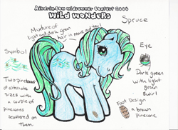 Description: Light blue pony with alternating stripes of dark and light green in the mane and tail. Symbol is two pine trees of different heights with scattered pinecones on the branches. Cutie mark is a pinecone. Eyes are dark green with a light green swirl for contrast.