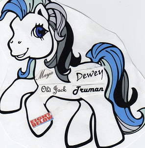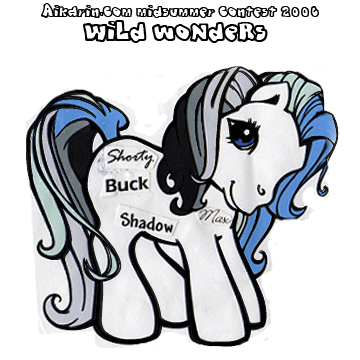 Description: Arctic Survivor is a beautiful white pony. Her mane starts at a light blue that fades to pale blue to light gray to dark gray to black. Her tail consists of the same five colors. She is a TAF "signature" pony. On her right side she has the names Shorty, Buck, Shadow, and Max in different fonts. Maya, Old Jack, Dewey, and Truman