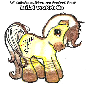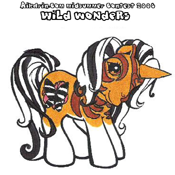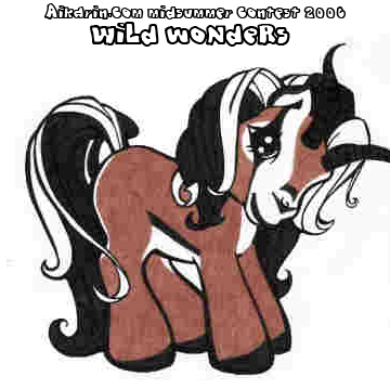 Description: Mountain Rill's most distinctive feature is obviously her hair and her stripes; her mane is similar to a Zebra's in that it never grows long enough to hang down; it is a few inches tall (on a full-grown horse) with a curve to it, the highest point of the arc being the middle of her neck, and the color is a creamy blond, but the last few centimeters are gradient-shaded dark brown. Her mane is long in comparison, fluttering down over her forehead with the paler blond hair under the stripe of dark brown. Her tail is similar to her mane, but much longer, the length of an average pony's tail, but with a stripe going down the very center of it.