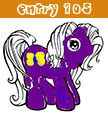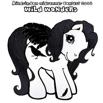 Description: Raven Glitter is a white pony with lavender coloured eyes, and a dark purple mane and tail. Her symbol is a little black raven with a white rhinestone eye. She has a black feather on her magnet hoof. Raven Glitter also has black feathered wings, and tinsel in her hair.