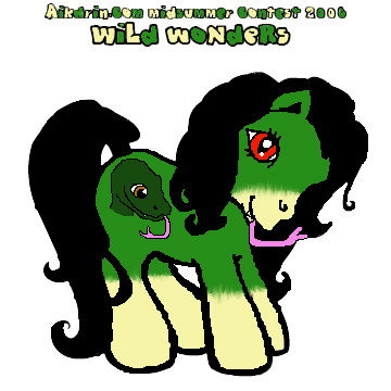 Description: Krazy Komodo is a female earth pony. She has black hair, a dark green body, red eyes with a snake-like pupil, and creme colored hoofs and snout.