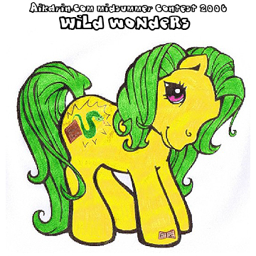 Description: Lethin is a yellow pony with green mane & tail and pink eyes. Symbol: A brown book, a light and dark green snake and gold color around the snake. A small book on leg.