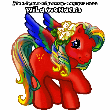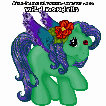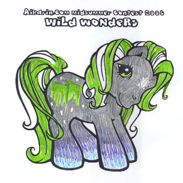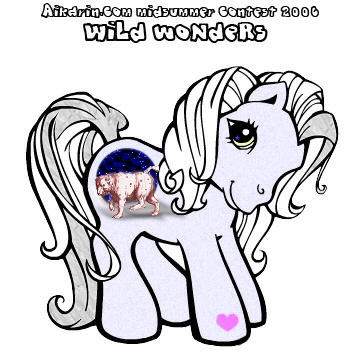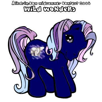 Description: Tethys is based on the Greek sea goddess/titaness; she was said to be responsible for keeping the constellations Ursa major and Ursa minor above sea level at all times. Tethys has a blue star in her eye and a yellow stripe. Her body colour is a shimmery powder blue whilst her hair is snow white with a silver forelock and one stripe down the base of her tail. Her symbol is a base of dark blue ocean with Ursa major complete with the actual constellation [Callisto/The Big Dipper] walking on silvery solar winds.