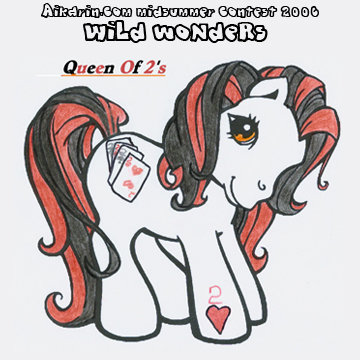Description: The Queen Of 2’s is a white coloured pony with red and black hair, her symbol is four playing cards with 2’s on them, hearts, spades, diamonds and clubs. A heart outlined in black, and a two above it indicates her hoof with the magnet. Her eyes are orange.