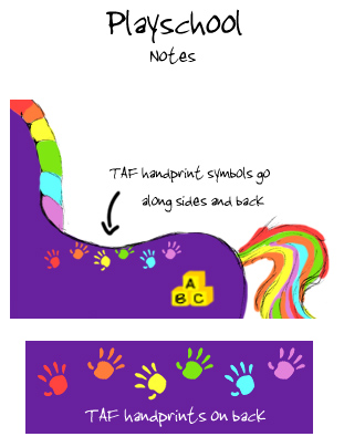 a TAF design of coloured handprints along her top sides and back