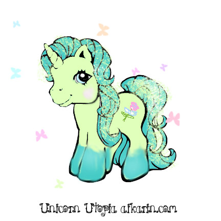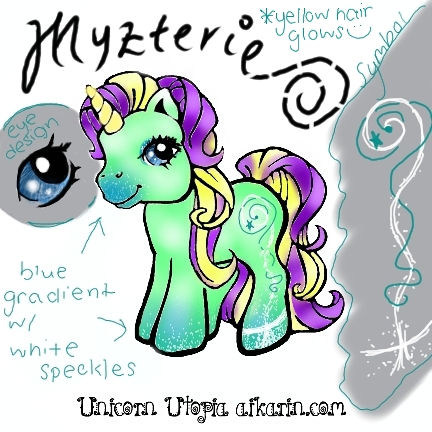 Description: Her name is Myzterie. a green unipony w/ blue speckled