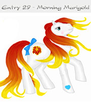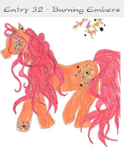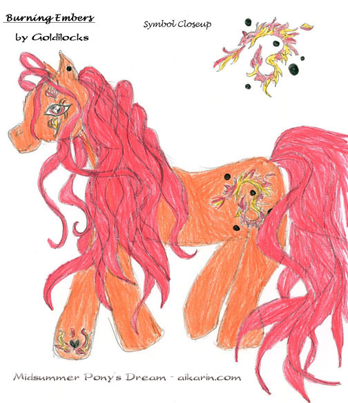 Embers is an orange pony with curly fiery red hair. Black hoof heart