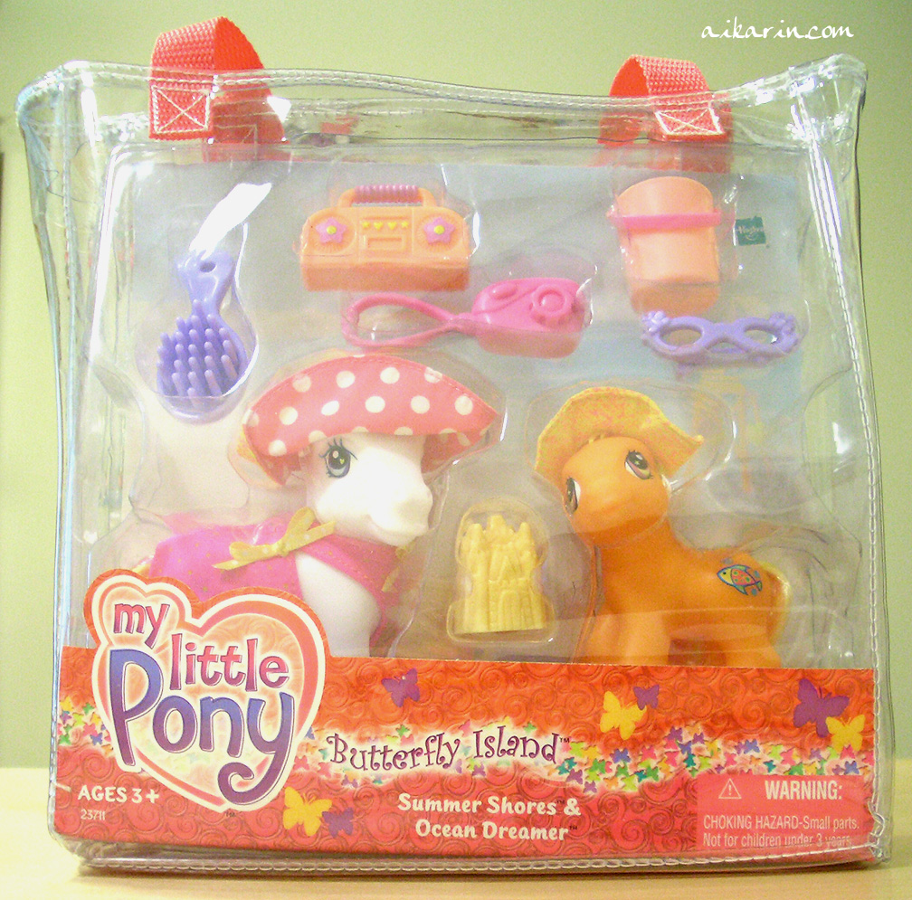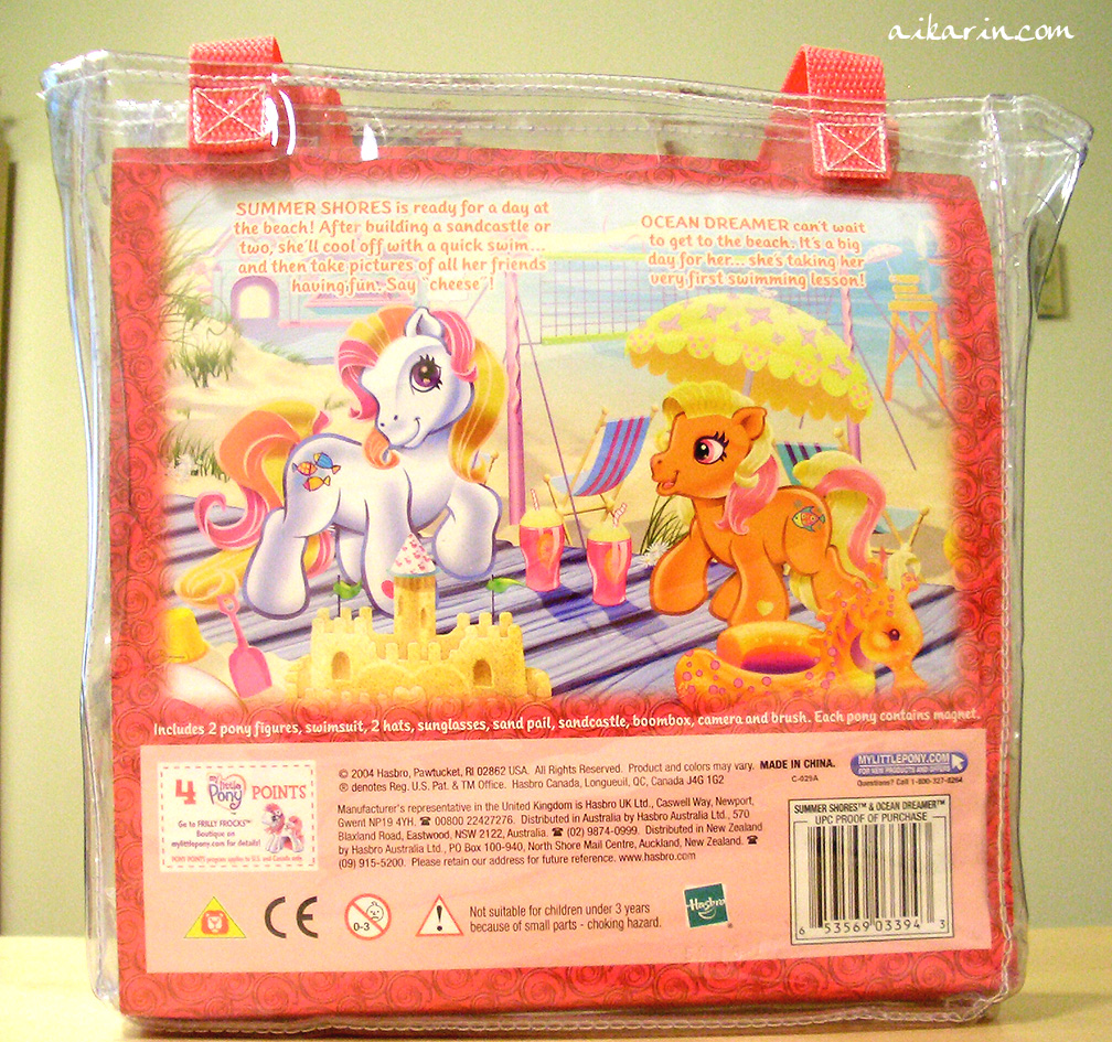 Shores is a white pony with 3 colorful fishies and 3 blue swirls.